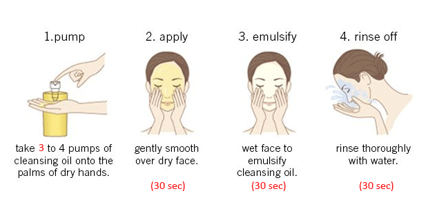 • If wear heavy makeup or focus on deep pore cleansing, you can extend time(up to 45sec) or increase amount of cleansing oil(total 4~5 pumps)