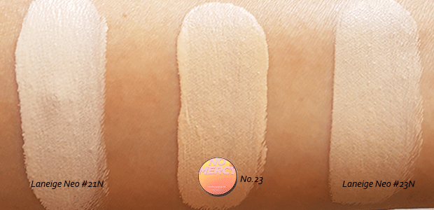 Have compared with Laneige Neo Cushion Matte and this No.23 is more yellow base compare to Laneige, once applied slightly brighter than Laneige Neo (N23), however it really makes your skin looks good even though warm-yellow tone base.