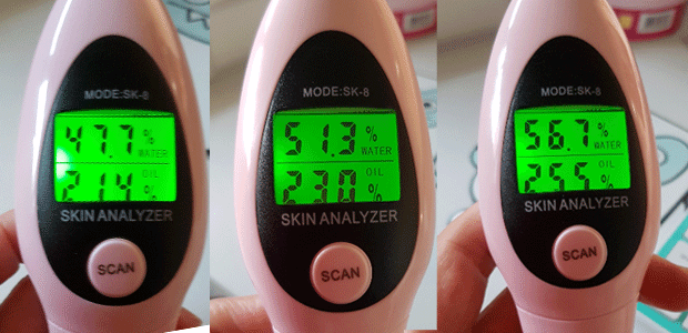 (One time tried, my skin’s hydration level increased (in summer time, normal skin water level is 40~60% and oil content for neutral skin 18~30%, so my skin is quite balanced and improved water/oil level)